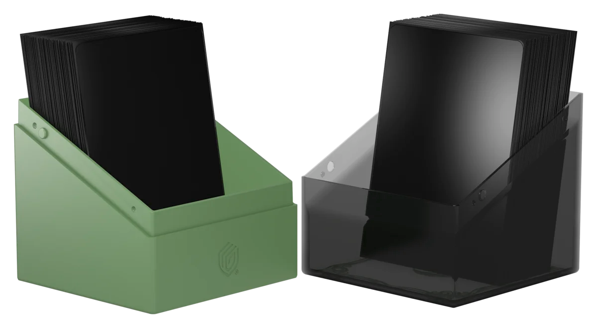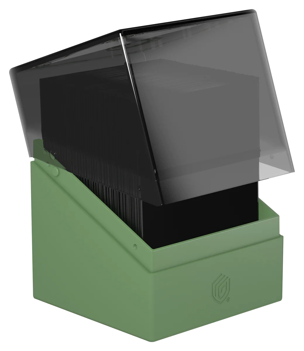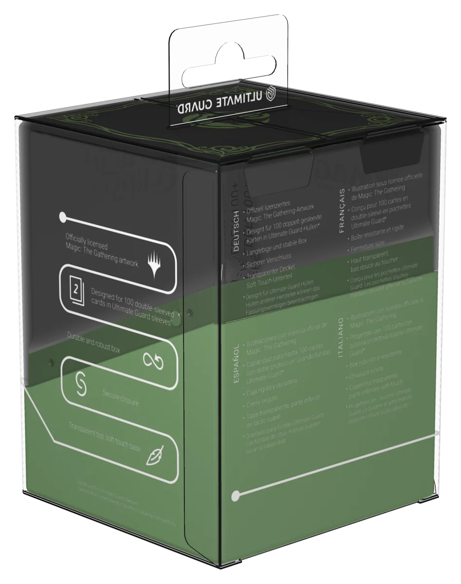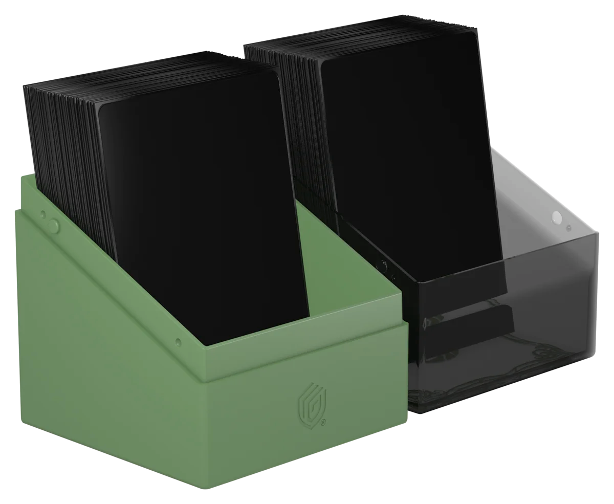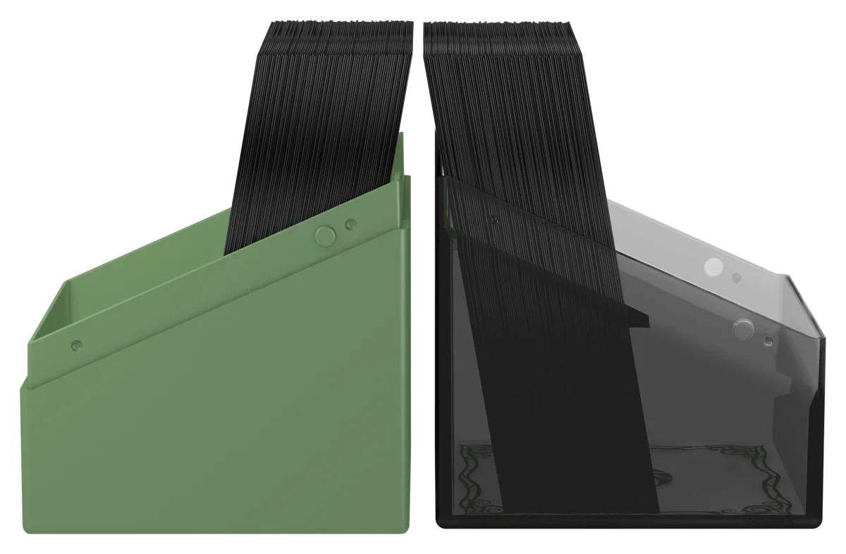 Può contenere fino a 100 carte double-sleeved (con bustine Ultimate Guard). Grazie al suo formato, si combina alla perfezione con le soluzioni Ultimate Guard di mass storage come Arkhive, Omnihive e anche con Flip’n’Tray.