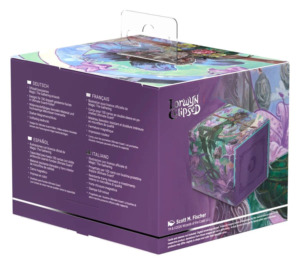 La chiusura magnetica mantiene il contenuto ben saldo e l’artwork ufficialmente licenziato “Lorwyn Eclipsed” è stampato in full color per un impatto visivo davvero unico. Con spazio per 100 carte double-sleeved (con bustine Ultimate Guard), è perfetta per Commander/EDH, Modern, Standard e altri formati.