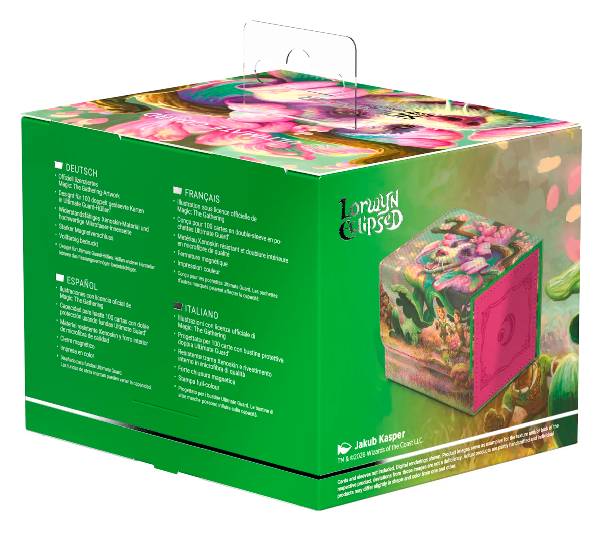 La chiusura magnetica mantiene il contenuto ben saldo e l’artwork ufficialmente licenziato “Lorwyn Eclipsed” dona un look spettacolare e in pieno colore. Studiata per contenere fino a 100 carte double-sleeved (con bustine Ultimate Guard), è perfetta per Commander/EDH, Modern, Standard e altri formati.
