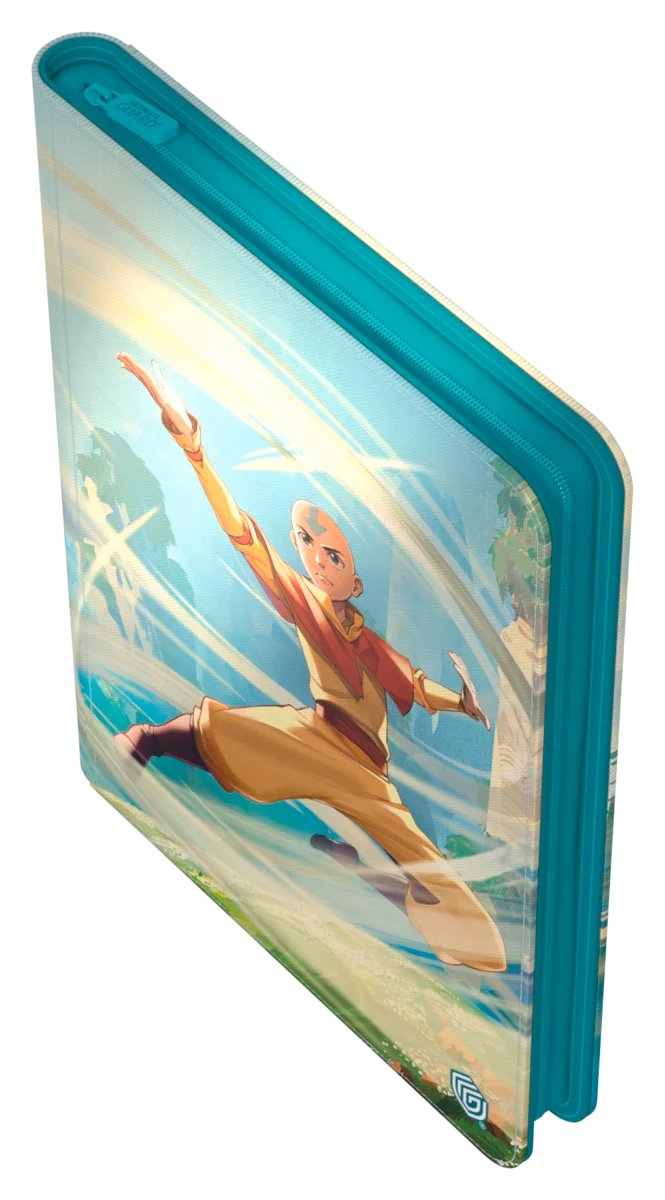 Album premium con chiusura a cerniera e finitura Xenoskin stampata full color a tema Aang. Offre 360 tasche su 20 pagine nere con inserimento side-loading per proteggere e mostrare la collezione in sicurezza.